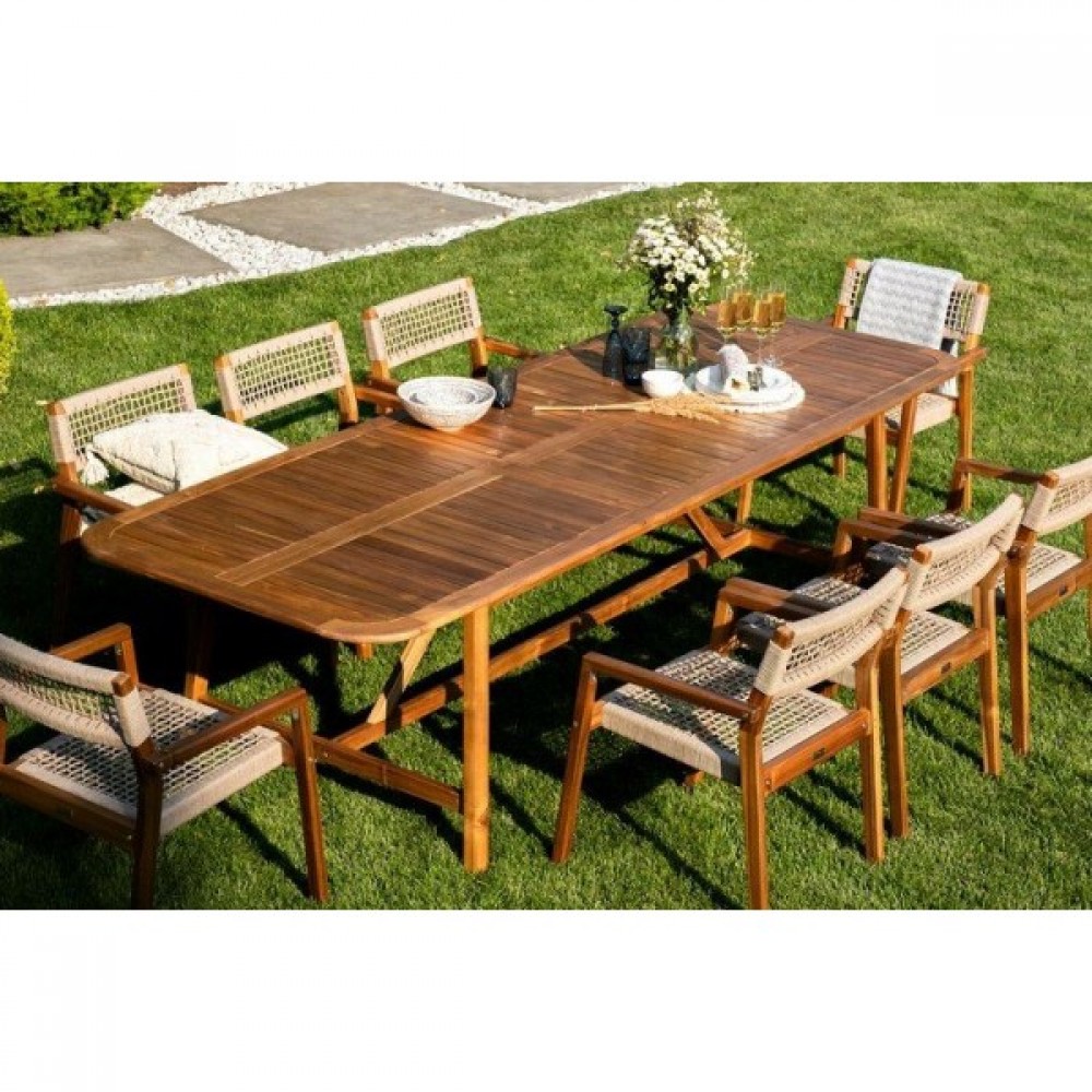 CALISTO – современная коллекция садовой мебели из акации, выполненная в комбинации натурального веревочного плетения rope, массива акации и бежевых подушек.