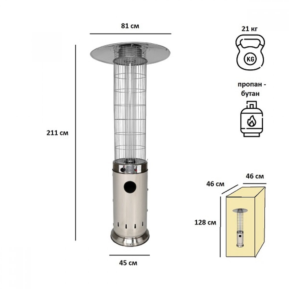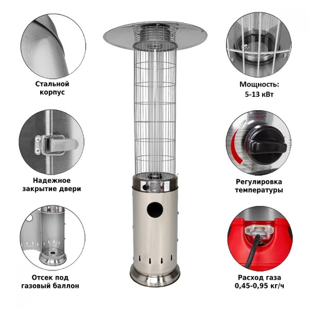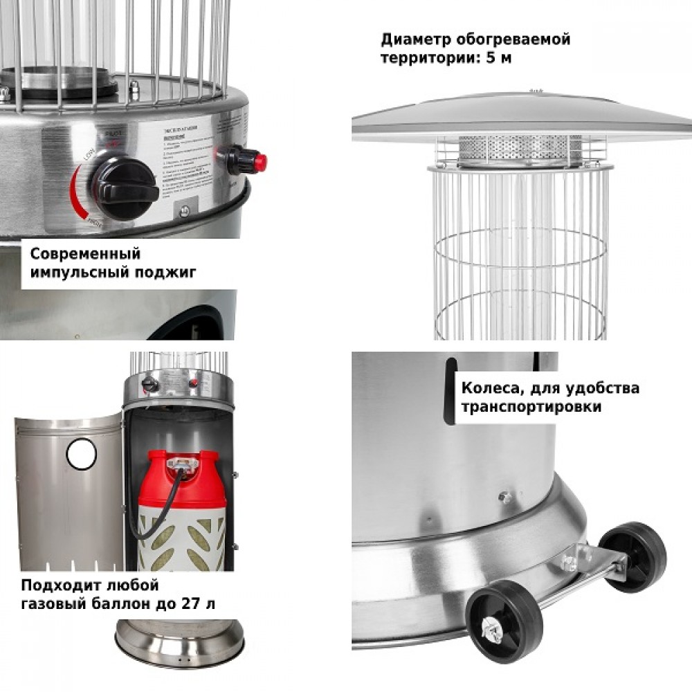 Обогреватель Aesto A-07T сделан из нержавеющей стали, благодаря чему выглядит красиво и ему не страшны царапины или небольшие механические повреждения. Подходит под любой газовый баллон до 27 л включительно (высота 59 см, диаметр 30 см). Газовый баллон и регулятор в комплект не входят.