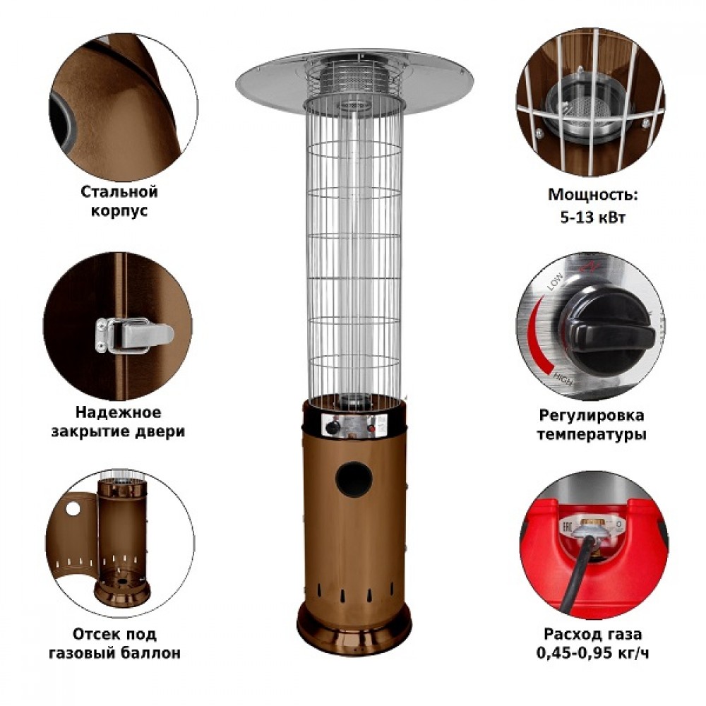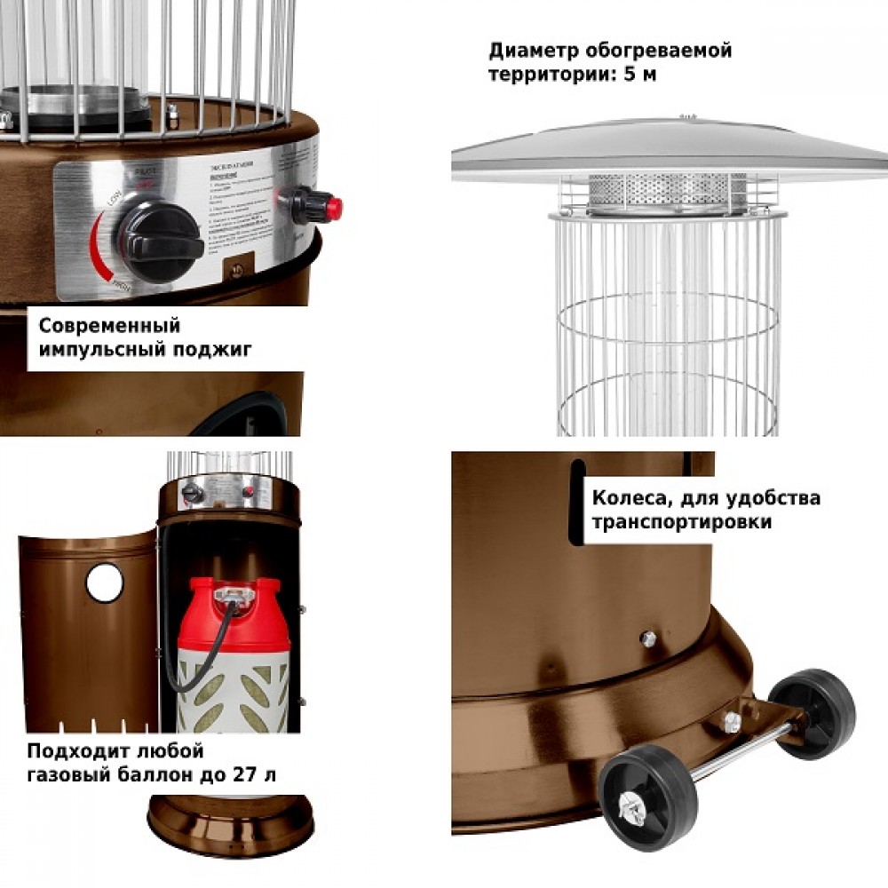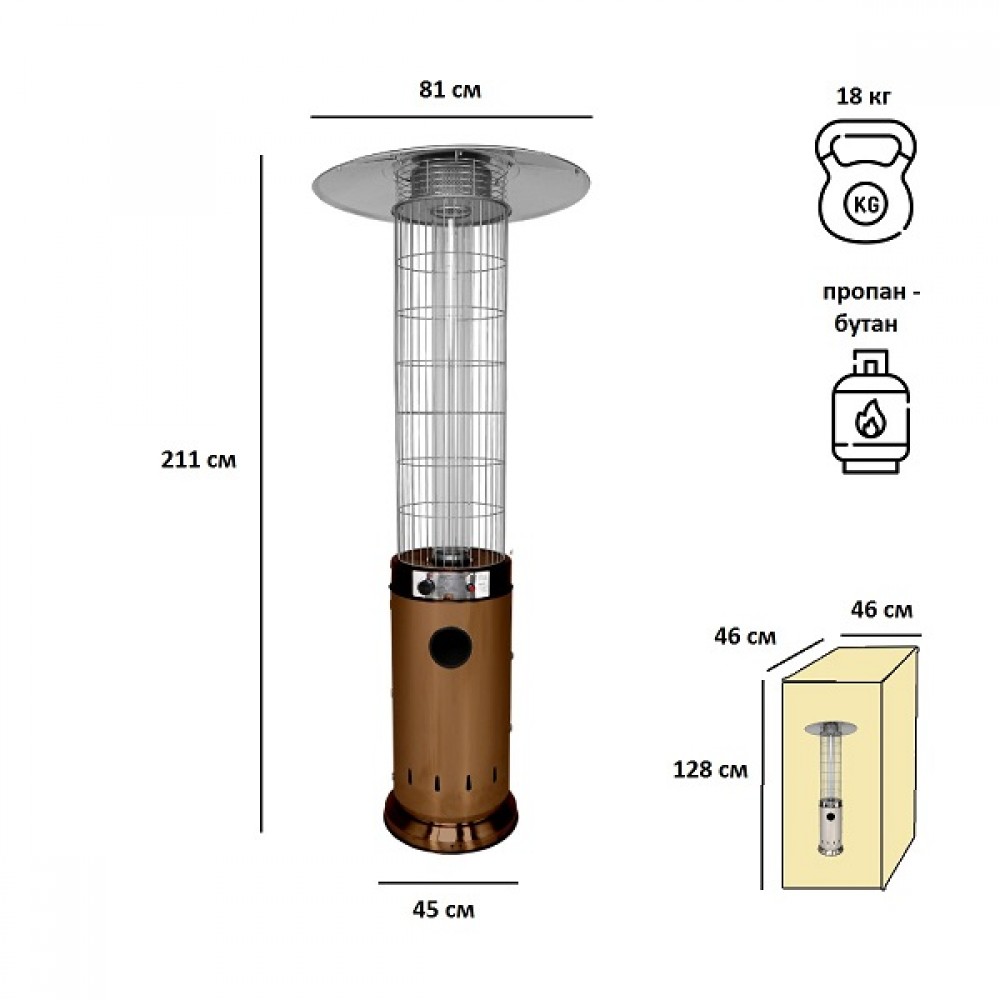 Подходит под любой газовый баллон до 27 л включительно (высота 59 см, диаметр 30 см). Газовый баллон и регулятор в комплект не входят.