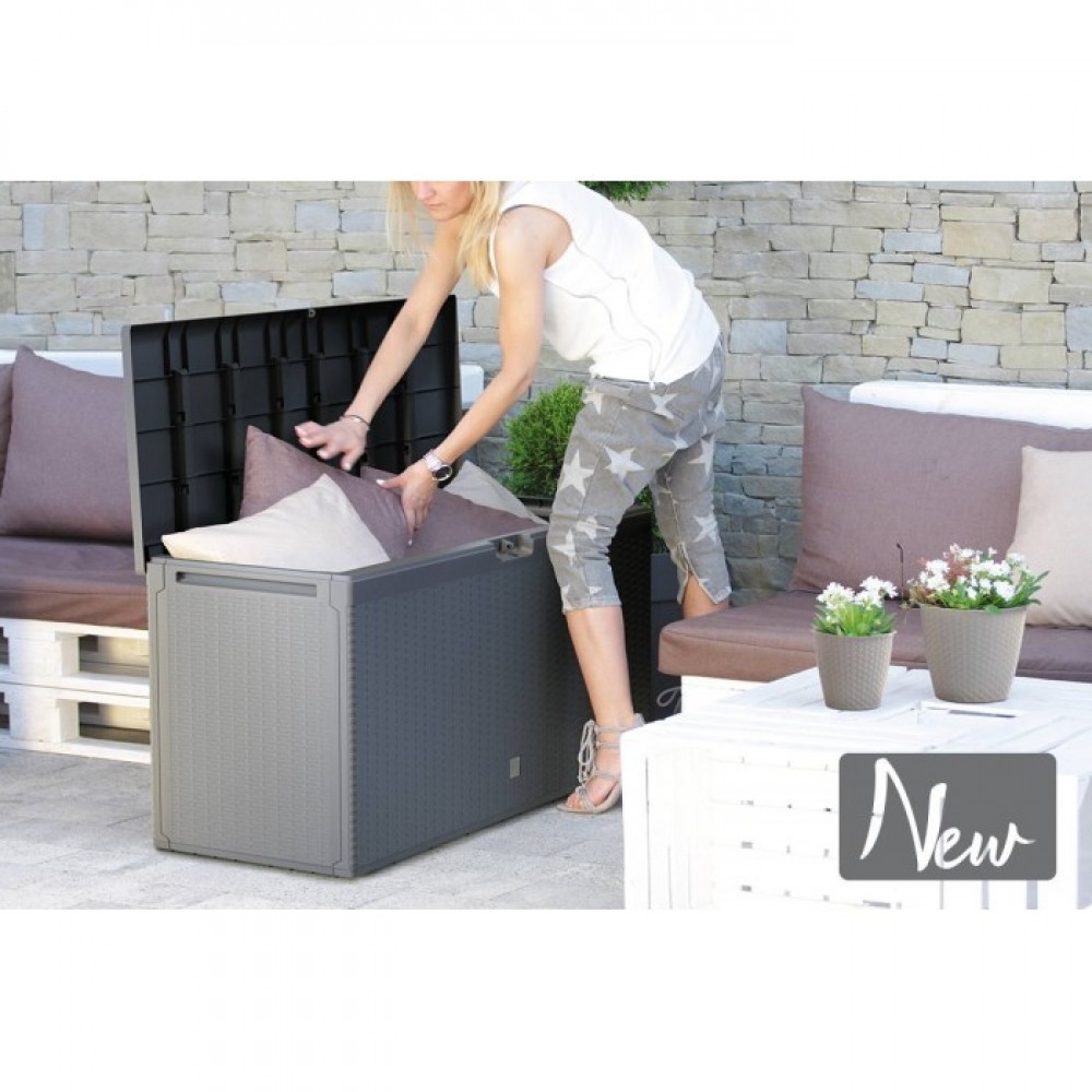 В ящиках для хранения удобно хранить подушки или другие предметы, а также эти ящики можно использовать в качестве столика. Изготовлены из пластика, имитирующего натуральный ротанг, дерево и бамбук. Ящики для хранения легко и быстро собираются без дополнительных инструментов. С двух сторон имеются ручки для переноски. Благодаря наличию проушины, ящик можно закрыть навесным замком.