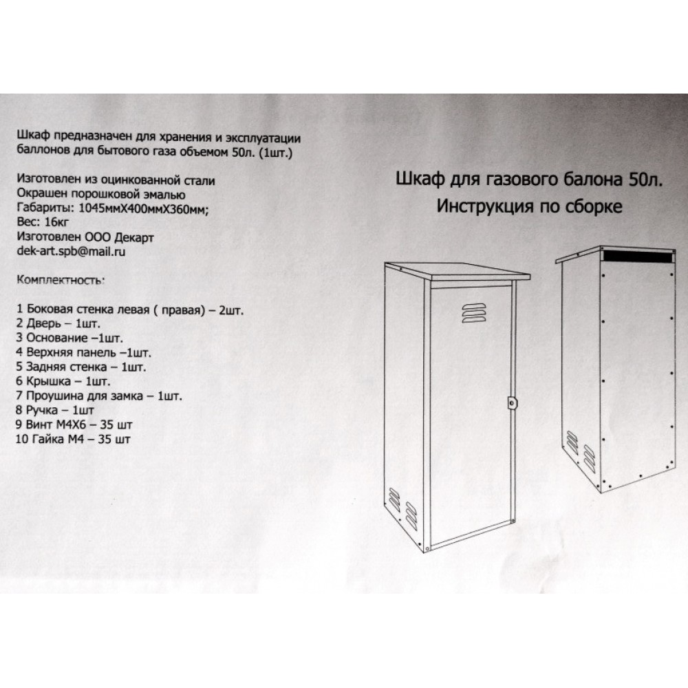 Представленный на сайте шкаф предназначен для постоянного хранения 1 баллона на 50 литров. Шкаф соответствует строгим требованиям противопожарной инструкции. В качестве материала для изготовления шкафа использована листовая оцинкованная сталь толщиной 1,0 мм, в стенках имеются вентиляционные отверстия. Баллон будет защищен от перегрева на солнце, а также от всевозможных атмосферных осадков, которые способны его повредить.